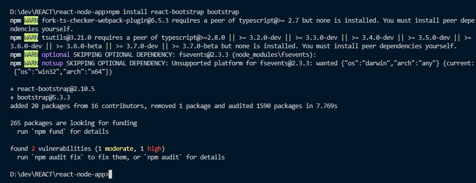 터미널을 열어 React Bootstrap과 Bootstrap의 기본 CSS 파일을 설치한다