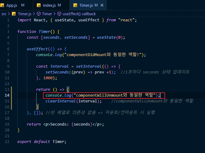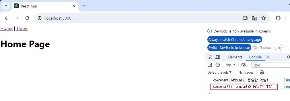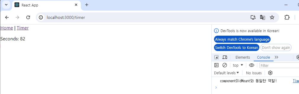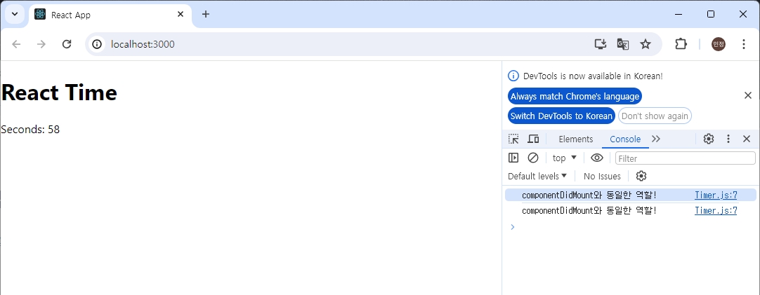 → 브라우에서 타이머 실행시 콘솔에 "componentDidMount와 동일한 역할!" 출력