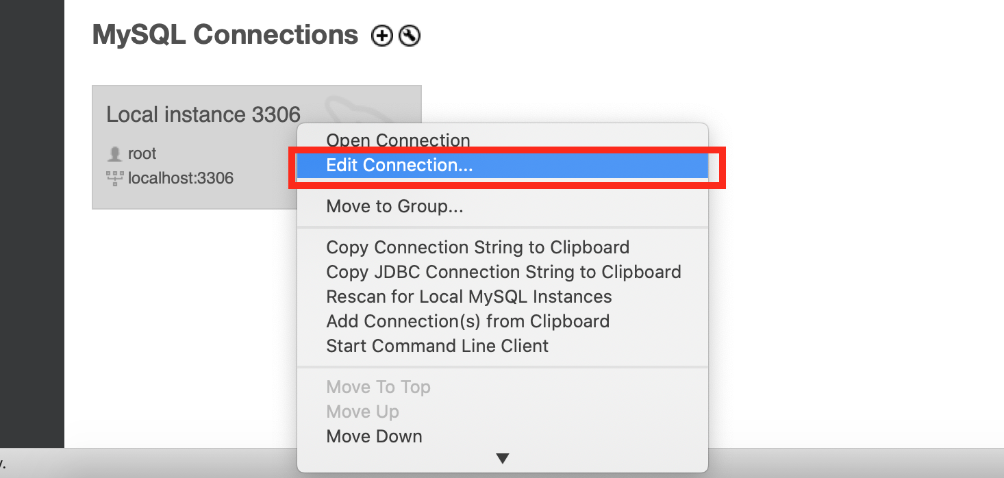 생성된 Local 커넥션에 마우스 오른쪽 버튼 클릭 → Edit Connection... 을 선택합니다