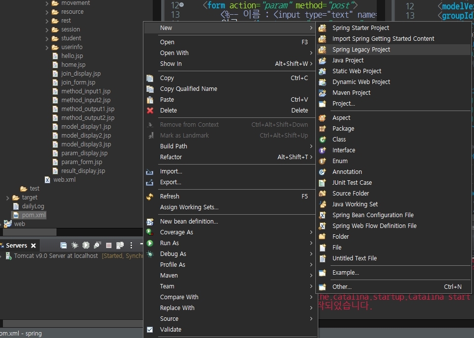 - PackageExplorer에서 spring legacy project를 만들어준다 (legacy는 스프링 프로젝트, starter는 스프링부트 프로젝트)