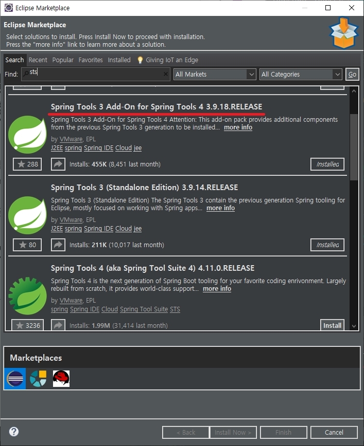 - sts 검색 후 spring Tools 3 Add-On for Spring Tools 4 다운