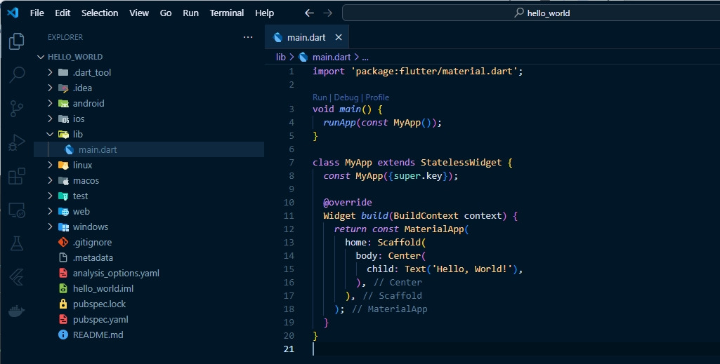 지난 포스팅때 cmd에서 신규 프로젝트를 생성하였고 lib 폴더 아래의 main.dart 파일을 수정하였다