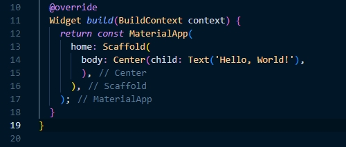 위젯이 화면에 그려질 때 build 메소드는 자동으로 호출되고 그 후 MaterialApp을 반환하게 된다