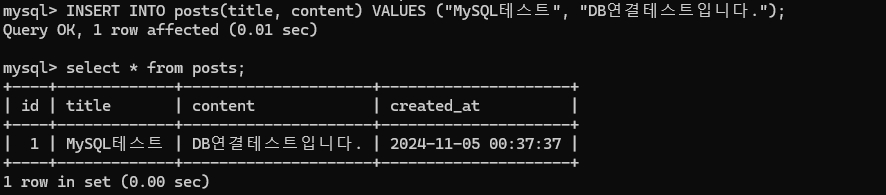 INSERT INTO posts(title, content) VALUES ("MySQL테스트", "DB연결테스트입니다.");