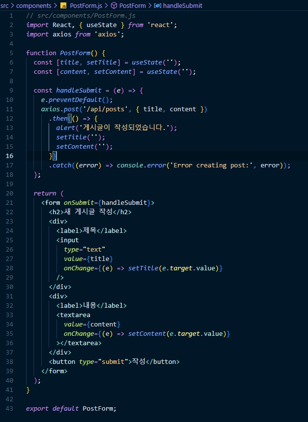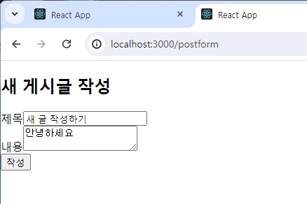 1. PostForm.js에서 게시글을 작성한 후, 서버에 POST 요청을 보내고 성공하면 PostList.js를 갱신