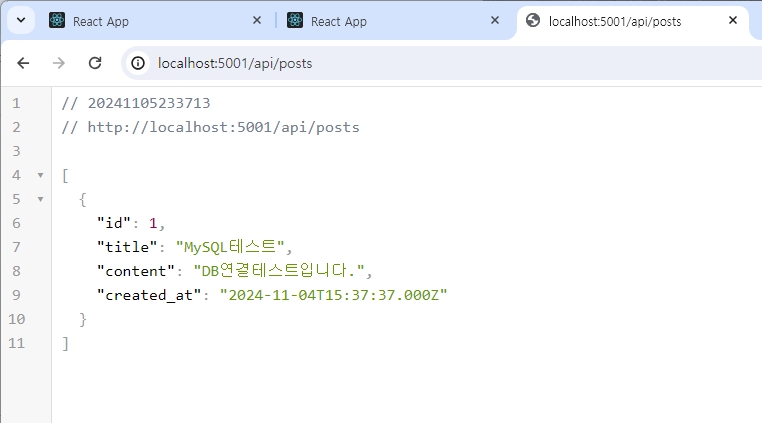 http://localhost:5001/api/posts를 직접 입력해 게시글 목록을 확인해볼 수 있다
