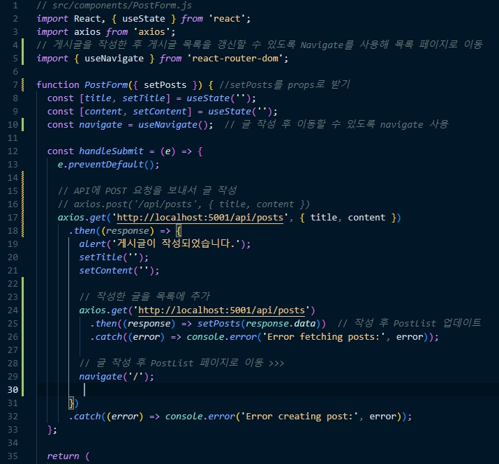 ☞ 게시글을 제출한 후, 게시글 목록을 갱신할 수 있도록 setPosts 함수나 navigate를 사용해 목록 페이지로 이동하도록 만들어줌