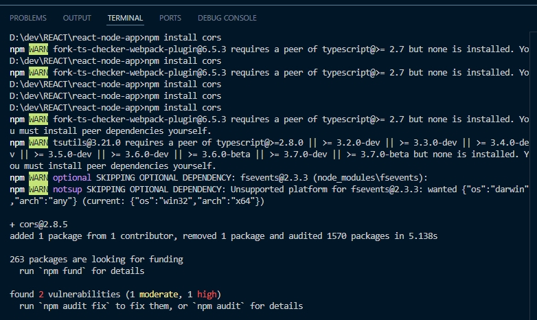 [REACT] npm 패키지 설치 중 warn 이슈 - fsevents, requires a peer of typescript