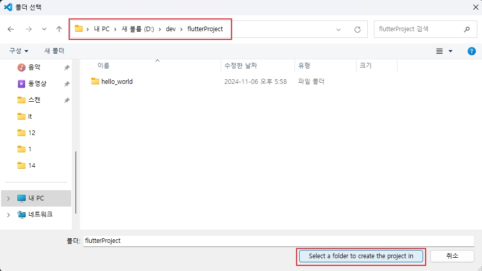 저장할 폴더 선택 후 Select a folder to create the project in
